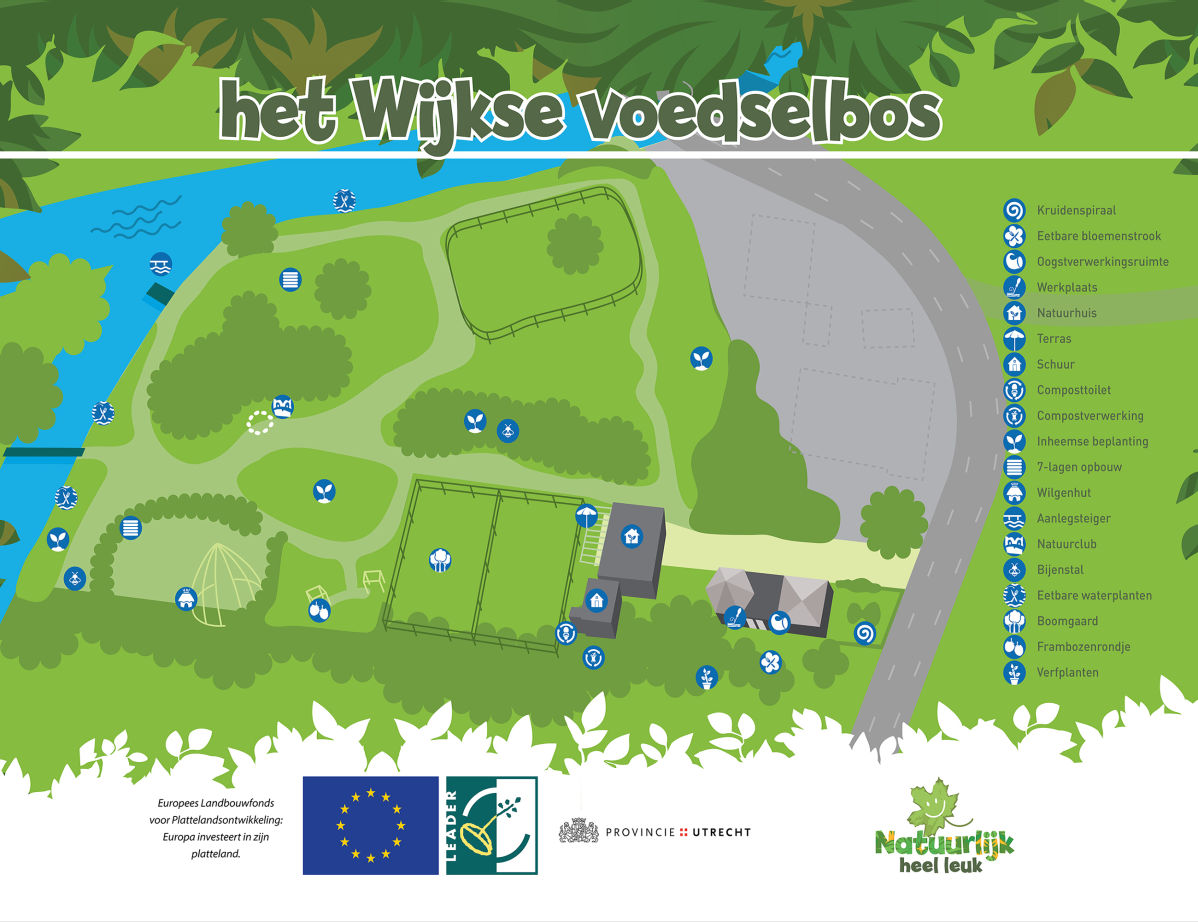 Europees Landbouwfonds voor Plattelandsontwikkeling Europa investeert in zijn platteland. Met behulp van financiering door Wijk bij Duurstede en Europese LEADER-subsidie gaan we voor de zomer van 2021 een voedselbos aanplanten, natuurlijke speelplekken met groene, eetbare verbindingsstroken inrichten en een beheergroep opzetten om dit nieuwe groen te onderhouden.